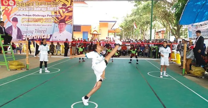 Dihadapan Bupati Mubar, La Ode M Rajiun Tumada, Wabup Achmad Lamani dan Sekda Mubar LM Husein Tali, tim sepak takraw putri memberikan penampilan memukau dengan smash tajamnya.