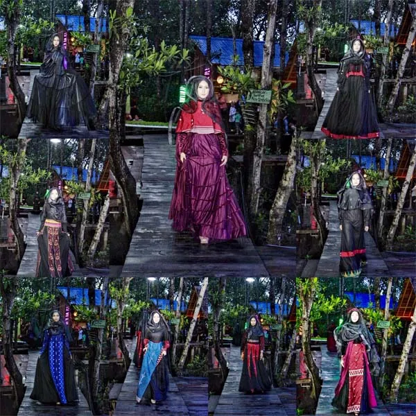 Kesan busana muslimah glamour dan lebih kuat pada warna hitam ditambahkan sentuhan potongan motif tenun Masalili berwarna merah, biru, hijau tosca, ungu dan cokelat disetiap detail baju adalah karya dari Irma Intan.