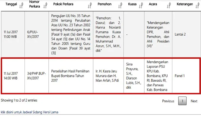 JADWAL SIDANG – Jadwal sidang Hasil Pemungutan Suara Ulang (PSU) Pemilihan Kepala Daerah (Pilkada) Bombana 2017 yang akan digelar Mahkamah Konstitusi (MK) pada 11 Juli 2017. (Foto: mahkamahkonstitusi.go.id).(Muhammad Taslim Dalma/ZONASULTRA.COM)