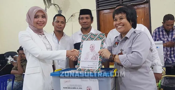 PENYERAHAN DUKUNGAN - Wa ode Rabia Al Adawia saat menyerahkan bukti dukungan ke KPU dan diterima oleh Anggota KPU Sultra, Tina Dian Ekawati Taridala. (Lukman Budianto/ZONASULTRA.COM)