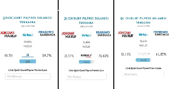ZONASULTRA.COM,KENDARI– Tiga lembaga survei mengambil sampel di Sulawesi Tenggara (Sultra) untuk quick count hasil Pemilihan Presiden (Pilpres) 2019. Ketiganya adalah Saiful Munjani Research and Consulting (SMRC), Indikator Politik Indonesia (IPI) dan Charta Politika.
