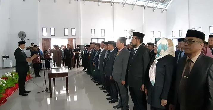 PELANTIKAN - Bupati Muna Barat (Mubar), Sulawesi Tenggara (Sultra) LM Rajiun Tumada kembali melantik 117 pejabat struktural terdiri atas jabatan pimpinan tinggi pratama, administrator, dan pengawas yang dilaksanakan di aula kantor bupati setempat, Jumat (21/2/2020) sore. (Kasman/ZONASULTRA.COM)