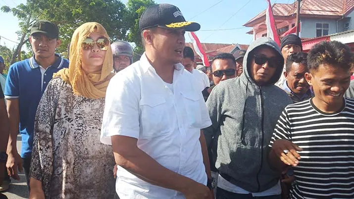 RAJIUN TUMADA - Bupati Muna Barat, Rajiun Tumada saat menuju ke salah satu rumah warga di bilangan Jalan Gatot Subroto, Kelurahan Laiworu Kecamatan Batalaiworu, Muna, pada Rabu (28/8/2019). (Nasruddin/ZONASULTRA.COM)