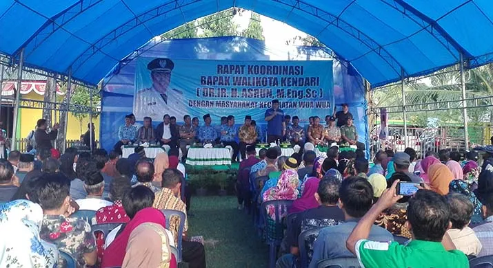 RAPAT KOORDINASI – Wali Kota Kendari, Sulawesi Tenggara Asrun, bersama wakilnya Musadar Mapasomba menggelar rapat koordinasi dengan masyarakat Kecamatan Wuawua, di lapangan kantor kecamatan setempat, Senin (18/9/2017) sore. Dihadapan masyarakat Asrun dan Musadar meminta pamit, sebab tugas mereka selama 10 tahun akan berakhir pada 8 Oktober 2017 mendatang. (RAMADHAN HAFID/ZONASULTRA.COM)