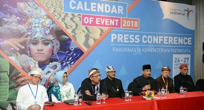 Rakornas Pariwisata Pakai Baju Adat, Menpar Sebut Kekuatan Pariwisata Indonesia RAKORNAS PARIWISATA – Konferensi Pers Rakornas Pariwisata yg ke-3 dan dihadiri oleh Menteri Pariwisata dan jajaran Pejabat Eselon 1 yaitu Sekretaris Kementerian (Bpk. Ukus Kuswara), Deputi Bidang Destinasi dan Industri Pariwisata (Bpk. Dadang Rizki Ratman) Deputi Bidang Pengembangan Pemasaran Pariwisata Mancanegara (Prof.I Gde Pitana) Deputi Bidang Pengembangan Pemasaran Pariwisata Nusantara (Ibu Esthy Reko) dan Deputi Bidang Pengembangan Kelembagaan Kepariwisataan (Prof. Dr. H.M. Ahman Sya). (Foto : kemenpar)