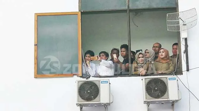 Rapat Tertunda : Terlihat para peserta rapat Rancangan Anggaran Pendapatan Belanja Daerah Perubahan (R-APBDP) 2016, tengah menyaksikan aksi demo Save Nur Alam, di Pelataran Kantor Sekretariat Dewan Perwakilan Rakyat Daerah (DPRD) Provinsi Sulawesi Tenggara (Sultra). Peserta rapat tersebut terdiri dari Lingkup Pegawai Sekretariat DPRD Sultra. (Foto : Sri Rahayu/ZONASULTRA.COM)