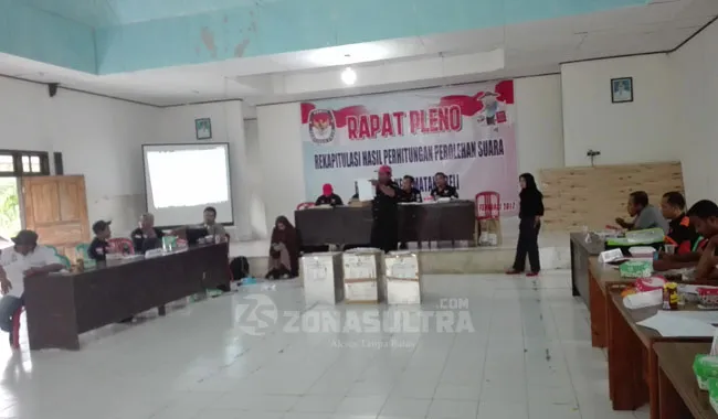 RAPAT PLENO - Anggota PPK Abeli saat melakukan rekapitulasi hasil perhitungan perolehan suara di tingkat kecamatan di aula Kantor Kecamatan Abeli, Jumat (17/2/2017). Dari hasil pleno oleh PPK Abeli pasangan calon Wali Kota Kendari nomor urut 1, Rasak-Haris berhasil menang telak. (RAMADHAN HAFID/ZONASULTRA.COM)