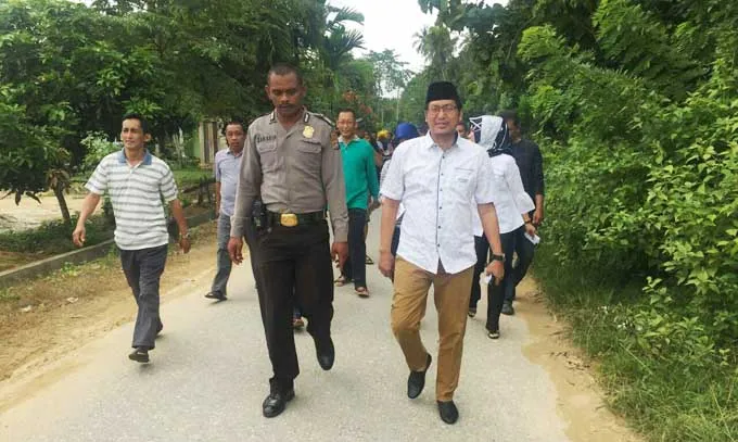 JALAN KAKI - Bersama keluarga dan para pendukungnya calon Walikota Kendari, Abdul Rasak berjalan kaki menuju TPS 2 Kelurahan Abeli Kecamatan Abeli untuk menyalurkan hak pilihnya. (M Rasman Saputra /ZONASULTRA.COM)