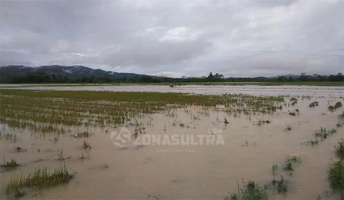 ZONASULTRA.COM, ANDOOLO – Ratusan hektar sawah di Kabupaten Konawe Selatan (Konsel), Sulawesi Tenggara (Sultra) terendam banjir. Para petani mengaku pasrah dengan keadaan yang menimpa tanaman mereka.