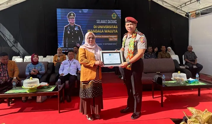 Ratna Umi Nurlila menerima langsung sertifikat penghargaan itu dari Kepala BNN Sultra, Brigjen Pol Chris Reinhard Pusung di Pelantaran kampus Universitas Mandala Waluya Kendari, Selasa, (10/9/2024).