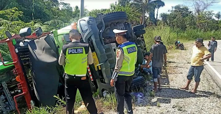 Rem Blong, Truk Muat 5 Mini Bus Terguling di Kolut