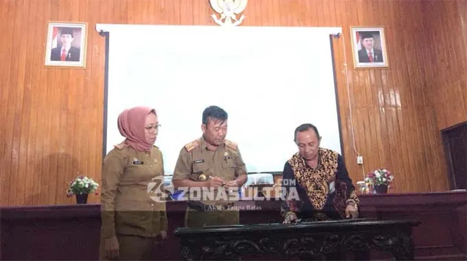 BPJS KETENAGAKERJAAN - Kepala BPJS Ketenagakerjaan Cabang Kendari La Uno (ujung kanan), Plh Sekretaris Kota Kendari Indra Muhammad saat melakukan penandatanganan MoU perihal pemberian jaminan sosial kepada pegawai non ASN lingkup Pemkot Kendari, Senin (5/2/2018) di Aula Pola Kantor Wali Kota Kendari. (ILHAM SURAHMIN/ZONASULTRA.COM)