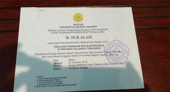 Berdasarkan jadwal kegiatan Nur Alam, pada 27 Agustus 2016 dirinya akan mengikuti ujian terbuka promosi doktor di Universitas Negeri Jakarta (UNJ).