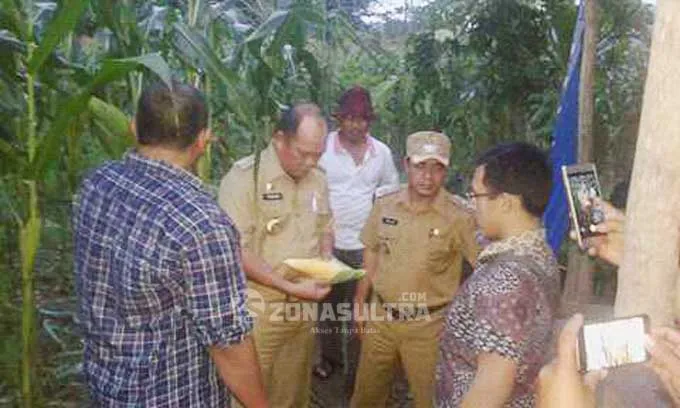 KUNJUNGAN KERJASAMA – Bupati Konawe Utara (Konut) Ruksamin bersama Wakil Bupati Konut Raup saat menunjukkan hasil buah jagung kepada pihak PT Jafpa Makassar dalam rangka menjalin kerja sama jual beli hasil panen jagung hibrida Konasara di wilayah Konut. (Jefri/ZONASULTRA.COM).