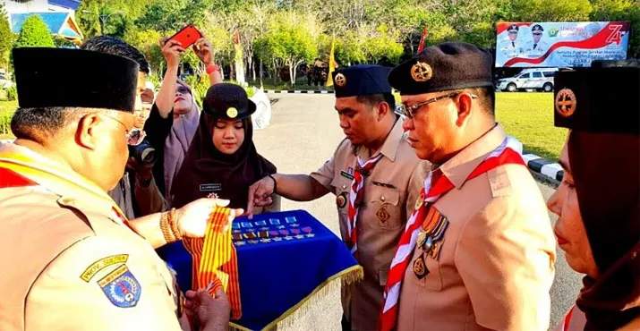 ZONASULTRA.COM, WANGGUDU – Bupati Konawe Utara (Konut), Sulawesi Tenggara (Sultra), Ruksamin menerima penghargaan Lencana Melati dan Karya Bhakti di bidang gerakan pramuka. Tanda jasa itu disematkan Ketua Kwartir Nasional (Kwarnas) Budi Waseso melalui Ketua Majelis Pembimbing Daerah (Kamabida) Ali Mazi dalam upacara Hari Pramuka ke-58 di pelataran Kantor Gubernur Sultra, Kamis (15/8/2019).