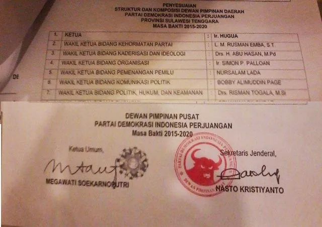 PDIP Sultra: SK perubahan struktur PDIP Sulawesi Tenggara (Sultra) yang ditandatangani Ketua Umum PDIP Megawati. Dalam SK tersebut masuk nama Rusman Emba, Abu Hasan, dan Bobby Alimudin Page. (Muhamad Taslim Dalma/ZONASULTRA.COM)