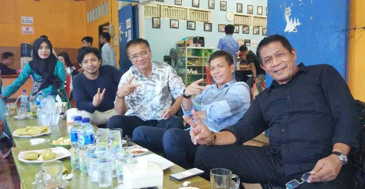 NGOPI BARENG - Calon Wakil Gubernur Sulawesi Tenggara (Sultra) nomor urut 2 Hugua (pertama dari kanan), bersama Ketua DPRD Sultra Abdurrahman Shaleh (ARS), Ketua PSSI Sultra Sabaruddin Labamba(SBL), di temani Zul Zivilia, saat ngopi bareng pecinta kopi di Warkop Haji Anto Jembatan Triping, Selasa (15/5/2018) sore. (Foto: Istimewa)