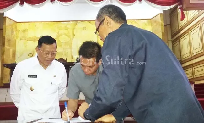 Penetapan Perda - Ketua DPRD Sultra Abdurrahman Saleh dan Wakil Gubernur Sultra Saleh Lasata saat menandatangani kesepakatan persetujuan raperda Penyertaan Modal Berupa Barang Milik Daerah pada PT Bank Pembangunan Daerah Sultra menjadi Perda, Kamis (28/1/2016). Dengan ditetapkannya perda ini Bank Sultra akan membangun gedung baru di lahan Islamic Centre. (Jumriati/ZONASULTRA.COM)
