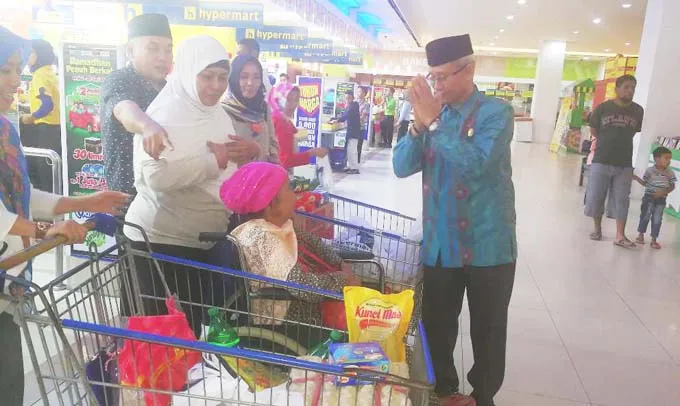 “Hari ini saya membawa dua orang kaum dhuafa ke Hypermart untuk berbelanja kebutuhan pokok sembako, meskipun tak seberapa semoga ini bermanfaat. Tapi ada sekitar 18 orang lainnya juga kami bawakan langsung ke rumahnya bantuan sembako,” ungkap mantan Bupati dua periode itu, Kamis (8/6/2017).