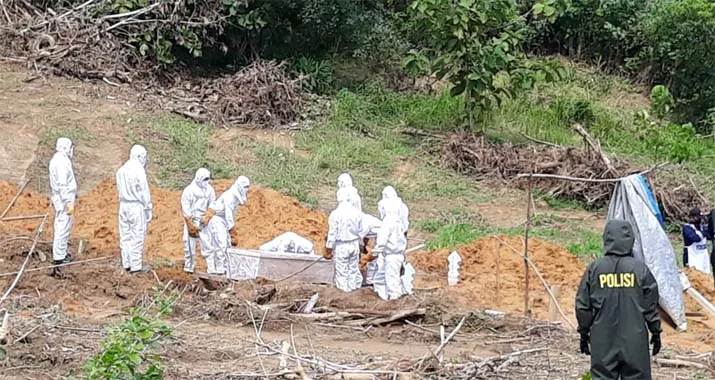 Jenazah pasien diperlakukan berdasarkan protokol kesehatan jenazah Covid-19. Jenazah telah dikebumikan di TPU Punggolaka Kota Kendari sekitar pukul 11.00 WITA oleh tim pemakaman jenazah Covid-19 dari RS Bhayangkara Polda Sultra. (b)