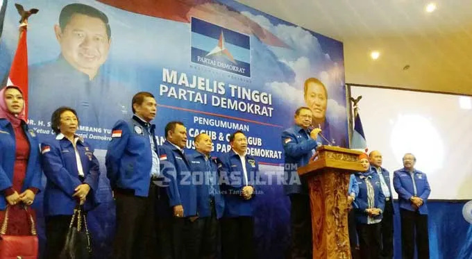 PILGUB SULTRA – SBY saat mengumumkan 17 calon gubernur dan calon wakil gubernur dari Partai Demokrat di Wisma Proklamasi, Jakarta Pusat, Minggu (7/1/2018). (Rizki Arifiani/ZONASULTRA.COM)