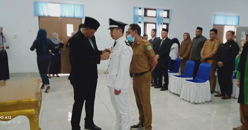 Pelantikan - Sekretaris Daerah (Sekda) Konawe, Ferdinand Sapan saat melantik Lurah Sendang Mulya Sari, Kecamatan Tonggauna, Kabupaten Konawe, Selasa (20/8/2022) (Istimewa)