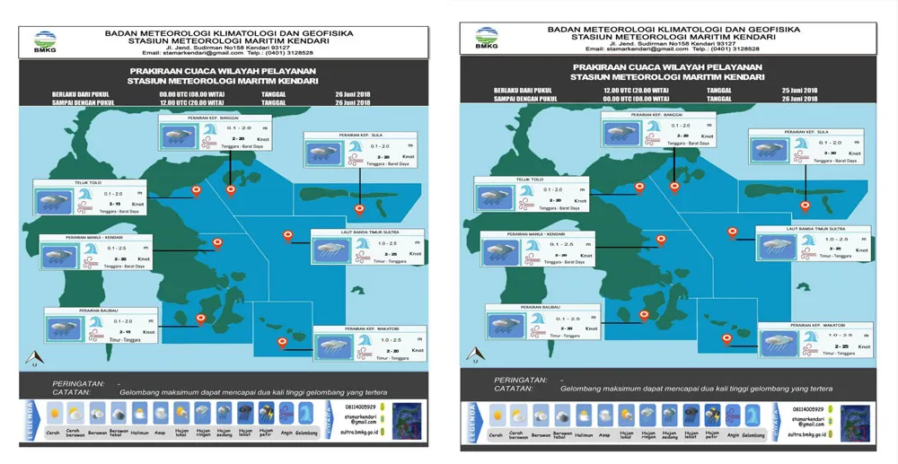 Pantauan BMKG di sejumlah titik pelayaran kapal penumpang, ketinggian ombak mencapai 2 meter. Untuk perairan Menui-Kendari ketinggian ombak diperkirakan 0,1 hingga 2,5 meter. Kemudian Perairan Wakatobi ketinggian gelombang dari 1 hingga 2 meter.