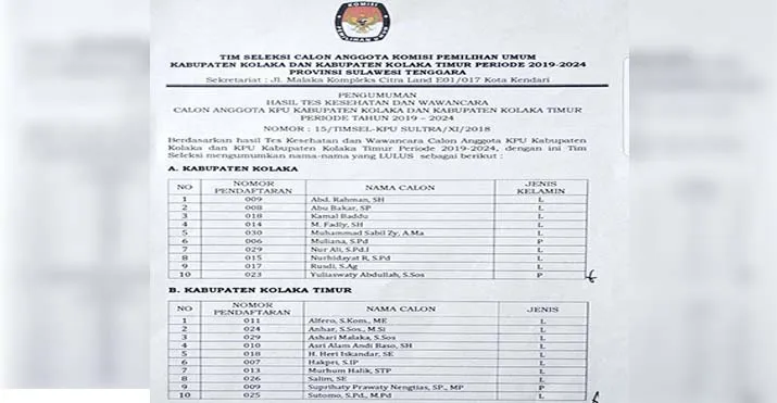 ZONASULTRA.COM, KENDARI – Tim seleksi calon komisioner Komisi Pemilihan Umum (KPU) Kabupaten Kolaka dan Kolaka Timur (Koltim) telah mengeluarkan 10 besar nama yang dinyatakan lulus tes kesehatan dan wawancara.