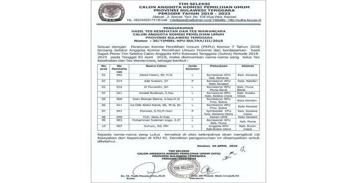 Nama-nama yang lolos antara lain Komisioner KPU Kabupaten Konawe Abdul Hasim, Komisioner KPU Kota Kendari Ade Surani, Komisioner KPU Muna Barat Ali Munardin, Komisioner KPU Kolaka Utara Asriadi Budiwan, serta Iwan Rompo Banne dan La Ode Abdul Natsir, yang keduanya adalah incumbent yang masih menjabat sebagai Komisioner KPU Sultra.