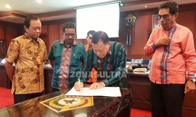 DERMAGA AL – Pelaksana tugas (Plt) Gubernur Provinsi Sulawesi Tenggara (Sultra) Saleh Lasata saat menandatangani nota kesepahaman dengan pihak PT DSF perihal pembebasan lahan pembangunan dermaga TNI AL di Kantor KSOP lama, Kamis (7/12/2017). (ILHAM SURAHMIN/ZONASULTRA.COM)