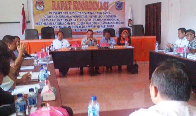 ZONASULTRA.COM, RAHA– Seluruh petugas Tempat Pemungutan Suara (TPS) yang bakal menggelar Pemungutan Suara Ulang (PSU) Pilkada Muna, Sulawesi Tenggara (Sultra) 22 Maret 2016 diganti. Seruan pergantian para petugas penyelenggara ini, disuarakan oleh calon Bupati Muna, Rusman Emba dalam rapat koordinasi antara Komisi Pemilihan Umum (KPU) Muna, bersama tim pasangan calon bupati dan wakil bupati, Panwaslu serta pihak kepolisian, Senin (7/3/2016).