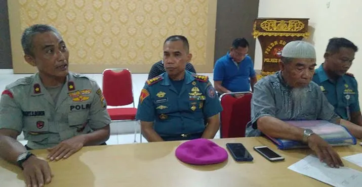 KLARIFIKASI - Letkol Marinir AF bersama orangtuanya Mardin More saat melakukan klarifikasi atas dugaan dirinya menodongkan senjata ke pimpinan Pondok Pesantren Ihya Ahsunnah di Kolaka, Muhammad Sutamin, didampingi Komandan Pos Angkatan Laut Kolaka, Lettu Sutedjo serta Waka Polres Kolaka, Kompol Robert di Mako Polres Kolaka, Jumat (10/1/2020). (Sitti Nurmalasari/ZONASULTRA.COM)