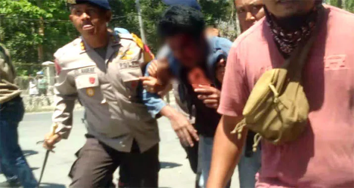 ZONASULTRA.COM, KENDARI – Seorang Anggota Intelijen Kepolisian Daerah (Polda) Sulawesi Tenggara (Sultra) Brigadir Pol MR diamuk oleh massa aksi di depan gerbang pintu masuk antara Mapolda dan kantor Gubernur Sultra, Selasa (22/10/2019).