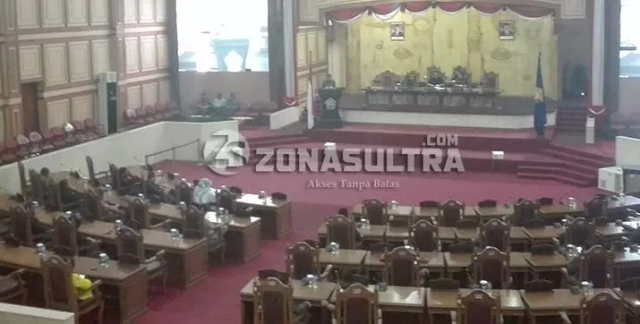 RAPAT PARIPURNA – Suasana rapat paripurna DPRD Sulawesi Tenggara (Sultra) dengan agenda pemandangan umum fraksi-fraksi DPRD Sultra terhadap Rancangan Peraturan Daerah tentang Perubahan Anggaran Pendapatan dan Belanja Daerah tahun anggaran 2017 di gedung paripurna DPRD setempat, Senin (11/9/2017). Dalam rapat paripurna tersebut, dari 45 anggota DPRD Sultra, sebanyak 13 anggota DPRD Sultra tidak hadir. (RAMADHAN HAFID/ZONASULTRA.COM)