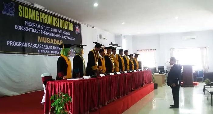 PROMOSI DOKTOR - Wakil Walikota Kendari, Musadar Mapasomba berhasil meraih gelar doktor (S3) di Fakultas Pertanian Universitas Halu Oleo (UHO) Kendari, Sulawesi Tenggara (Sultra), Kamis (4/8/2016). Musadar berhasil mempertahankan disertasinya di hadapan para tim penguji dalam sidang promosi doktor di Kampus Pascasarjana UHO. (JUMRIATI/ZONASULTRA.COM)