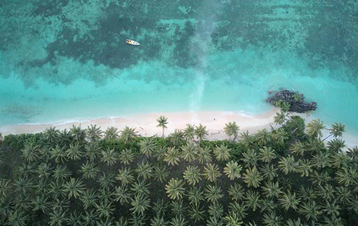 Pantai Pasir Panjang Pulau Labengki tampak dari atas. Pasirnya putih dan lautnya berwarna toska.