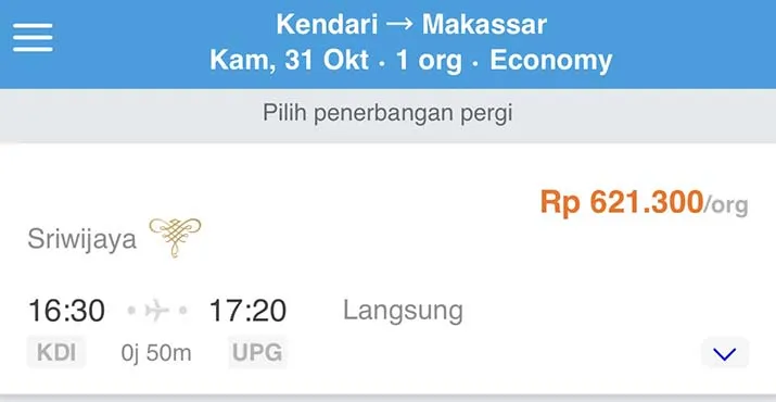 Penerbangan dari Kendari ke Makassar menggunakan Sriwijaya Air tersedia pada tanggal 31 Oktober 2019. (Sumber : Traveloka.com)