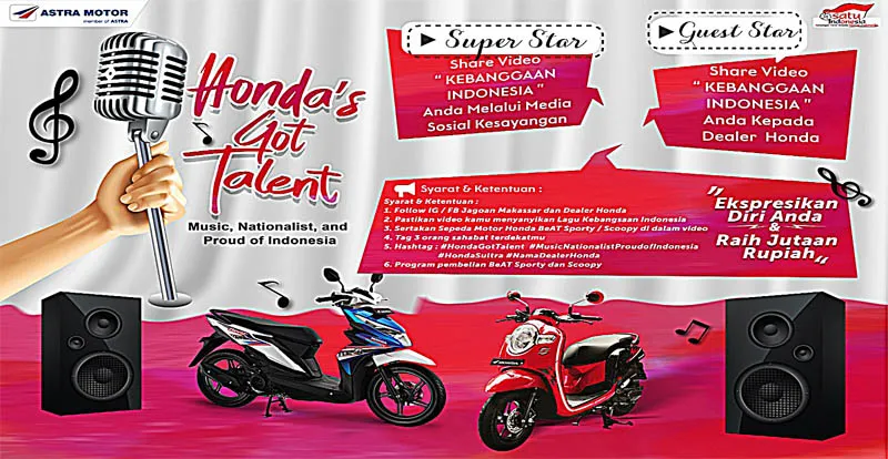 Bertajuk “Honda Got Talent” dan dalam bulan semangat pemuda, Astra Motor mengajak seluruh konsumen untuk membuat video dengan konten kreatif dan bernyanyi lagu nasional Indonesia.