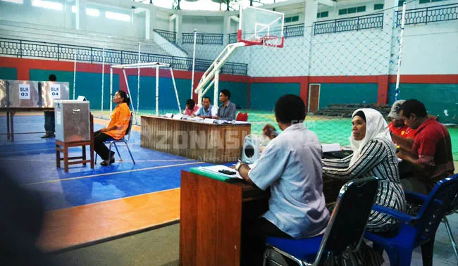 Antusias warga dalam PSU di TPS 1 Raha bertempat di GOR Pailangkuta. Mereka menunggu panggilan untuk memilih pasangan bupati dan wakil bupati Muna 2016-2021. (Kiki/ZONASULTRA.COM)