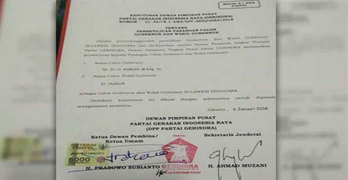 ZONASULTRA.COM, KENDARI – Setelah melalui proses yang cukup panjang, akhirnya Surat Keputusan (SK) dukungan partai Gerindra di Pemilihan Gubernur (Pilgub) Sulawesi Tenggara (Sultra) 2018 diberikan untuk pasangan Asrun-Hugua (SURGA).