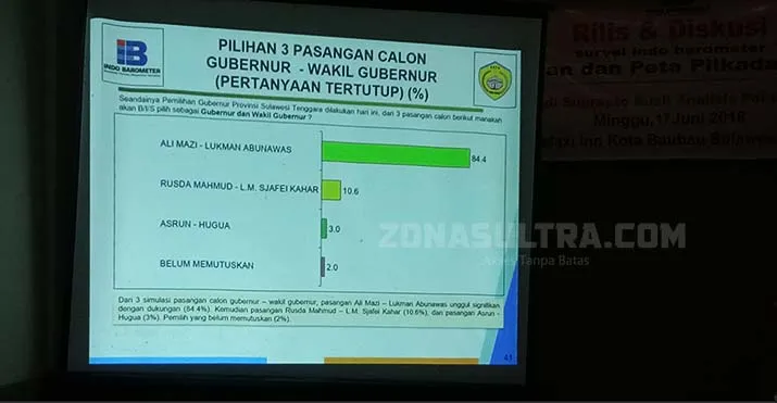 Peneliti Indo Barometer Hadi Suprapto Rusli memaparkan, paslon Gubernur Sultra nomor urut satu, Ali Mazi-Lukman Abunawas khusus di Kota Baubau menduduki poin tertinggi dengan persentase sebesar 84,4 persen. Sementara paslon nomor urut tiga, Rusda Mahmud-Sjafei Kahar menduduki urutan kedua dengan persentase hasil survey sebesar 10,6 persen.