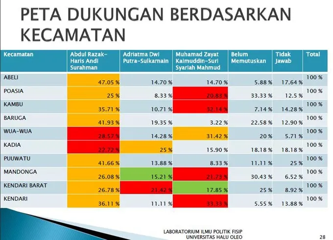 Jika mengacu dari hasil survei Fakultas Ilmu Politik UHO itu salah satu yang menjadi perhatian tim pemenangannya lanjut Rasak, masih tingginya persentase jumlah pendukungnya yang mungkin pindah ke calon lain pilihannya yakni 27,38 persen.