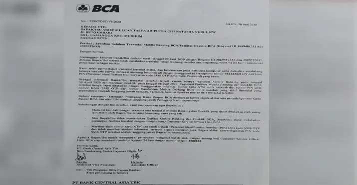 Bank BCA telah menanggapi aduan nasabahnya itu melalui surat resminya nomor 23907/DSCV2020 dengan request D2089481322 dan 2089522633 tertanggal 16 Juni 2020 membenarkan adanya proses transaksi melalui Oneklik BCA dan Mobile Banking BCA pada 8 Juni 2020 lalu.