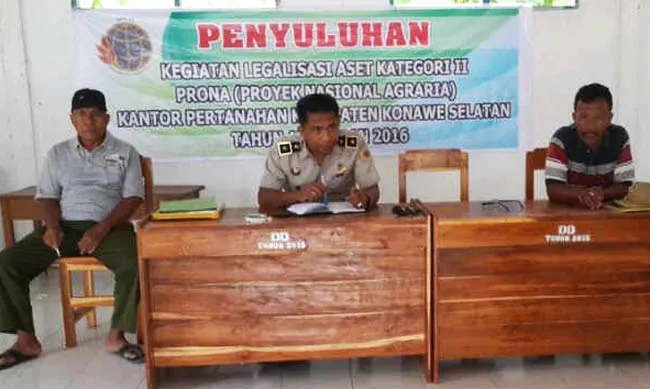 ZONASULTRA.COM, ANDOOLO – Badan Pertanahan Nasional (BPN) Kabupaten Konawe Selatan (Konsel), Sulawesi Tenggara (Sultra) pada tahun 2016 mendapatkan jatah sertifikat Program Operasi Nasional Agraria (Prona) sebanyak 2.000 bidang tanah. Sertifikat itu akan tersebar di 31 desa dan 15 kecamatan di Konsel, diantaranya Kecamatan Kolono, Palangga, Moramo dan Kolono Timur.