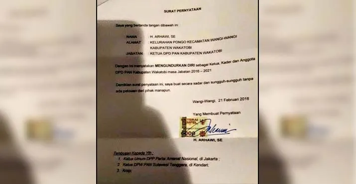 PENGUNDURAN DIRI - Surat pengunduran diri Arhawi sebagai Ketua DPD PAN Kabupaten Wakatobi. Surat pengunduran diri ini dibuat Arhawi secara sadar dan sungguh-sungguh tanpa ada paksaan dari pihak manapun dan ditandatangani langsung di atas materai 6000, pada tanggal 21 Februari 2018. (Foto: Istimewa)