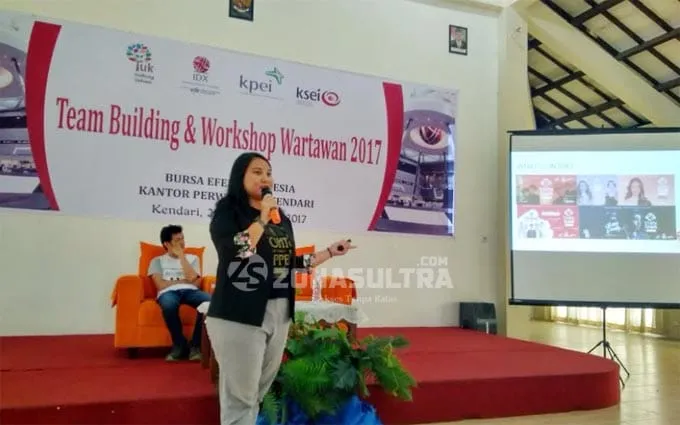 WORKSHOP WARTAWAN - Kepala Kantor Bursa Efek Indonesia (BEI) Kantor Perwakilan Kendari Epha Karunia Titasari saat memberikan materi tentang pasar modal dalam kegiatan team building dan workshop wartawan 2017 di Wonua Monapa, Jumat (24/11/2017). Pihaknya ingin menambah wawasan jurnalis tentang dunia pasar modal, juga mempererat jalinan silahturahmi dengan kawan media. (Sitti Nurmalasari/ZONASULTRA.COM)