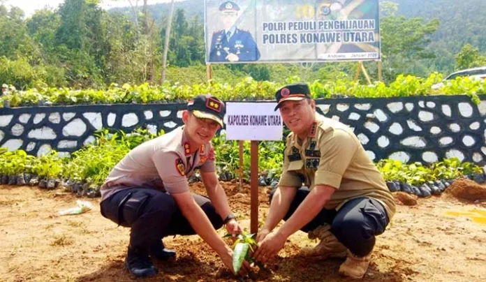 ZONASULTRA.COM,WANGGUDU– Jajaran Kepolisian Resort (Polres) Kabupaten Konawe Utara (Konut), Sulawesi Tenggara (Sultra), bersama Pemerintah Daerah (Pemda) Konut melakukan aksi tanam 4 ribu pohon pelindung di area Kantor Polres Konut, Kamis (9/12/2020).