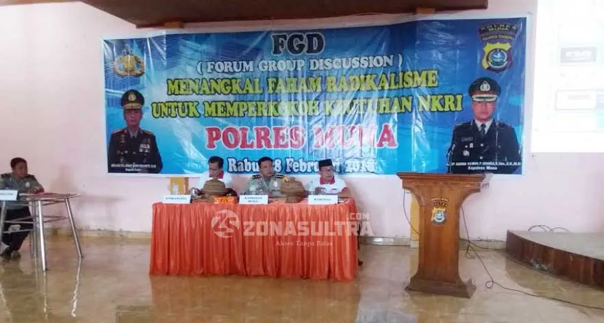 ZONASULTRA.COM, RAHA – Guna menangkal paham radikalisme, Kepolisian Resort (Polres) Muna menggelar focus group discussion (FGD) bersama stakeholder terkait di salah satu hotel di Kota Raha, Rabu (28/2/2018).