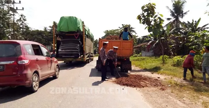 ZONASULTRA.COM, UNAAHA – Dalam upaya meminimalisir kecelakaan selama arus mudik lebaran tahun 2018, Satuan Lalulintas (Satlantas) Polres Konawe, Sulawesi Tenggara (Sultra) bersama Balai Pemeliharaan Jalan, Dinas Pekerjaan Umum (PU) melakukan penambalan jalan berlubang, Kamis (7/6/2018).