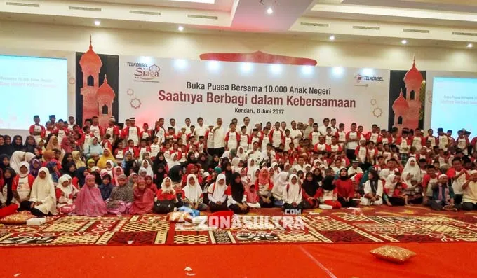 ZONASULTRA.COM, KENDARI – Telkomsel menggelar buka puasa bersama dengan 350 anak yatim, piatu, yatim piatu, dan kaum dhuafa di Hotel Grand Clarion Kendari, Kamis (8/6/2017). Selain memberikan santunan kepada anak yatim, Telkomsel juga memberikan bantuan bagi sembilan yayasan atau masjid yang ada di Kota Kendari.